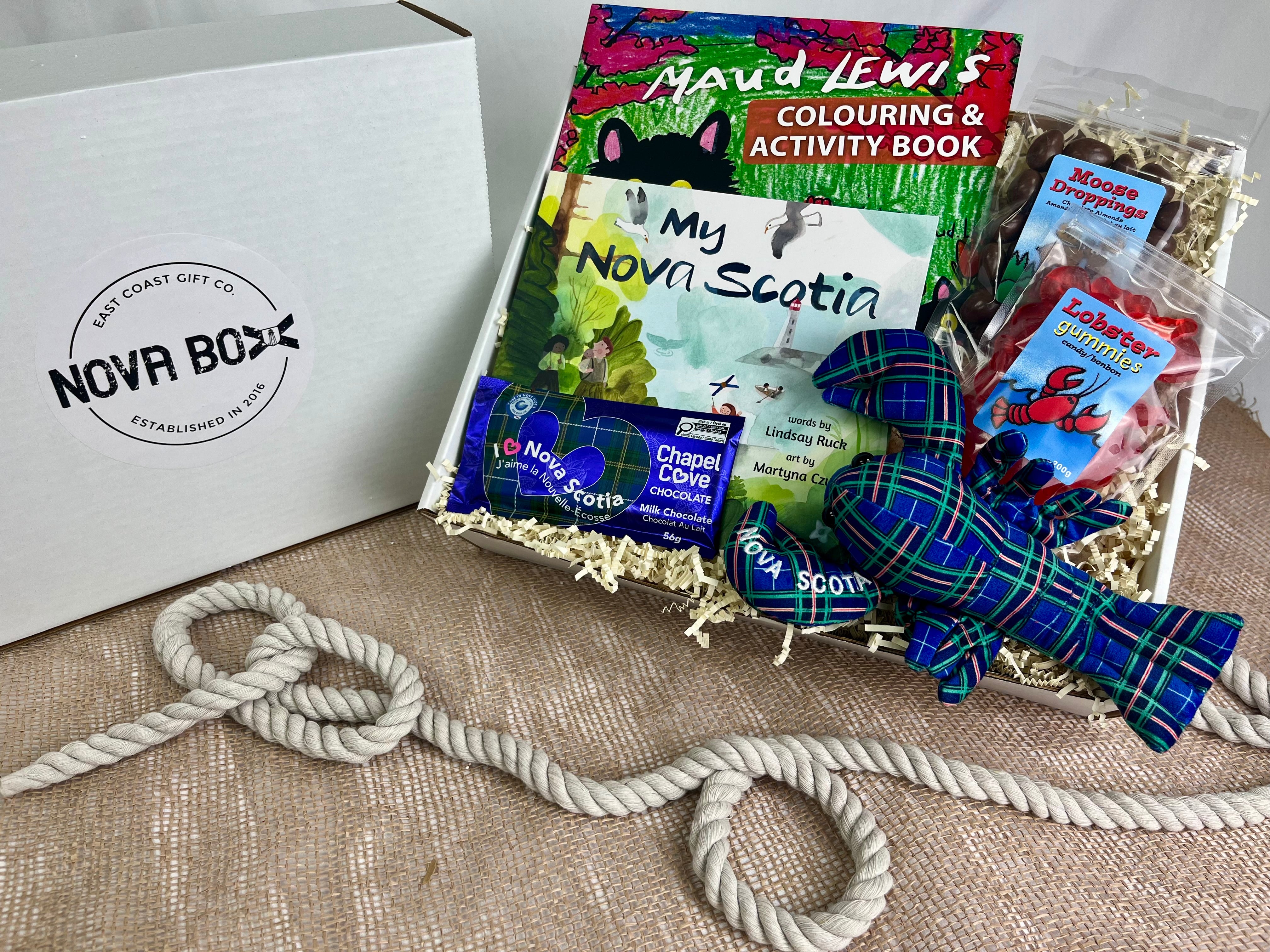 A bundle of fun for the little ones! This box includes a storybook, activity book, plush lobster, and sweet treats and chocolate ‘moose droppings' - perfect for playtime and snack time.